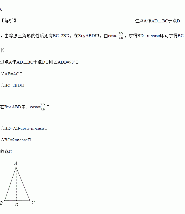 已知在△ABC中,AB=AC=m,∠B=α,则边BC的长等于( )