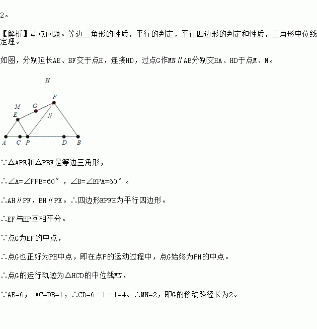 已知线段AB=6,C.D是AB上两点,且AC=DB=1,P是线段CD上一动点,在AB同侧分别作等边三角形APE和等边三角形PBF,G为线段EF的中点,点P由点C移动到点D时,G点移动的路径长度为 ▲ .