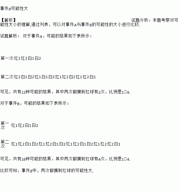 事件A:随机摸出一个球后放回,再随机摸出一个球,两次都摸到红球;