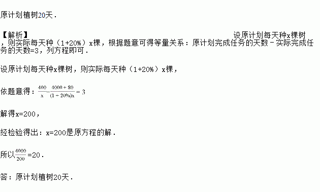 为了改善生态环境,某乡村计划植树4000棵.由于志题者的支援,实际工作效率提高了20%,结果比原计划提前3天完成,并且多植树80棵,原计划植树多少天?