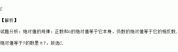 C 【解析】 试题分析:绝对值的规律:正数和0的绝对值等于它本身,负数的绝对值等于它的相反数. 绝对值等于7的数是±7,故选C.