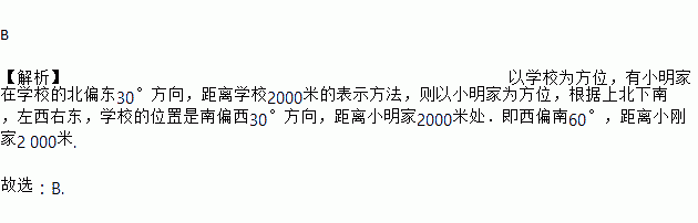 C. 西偏南30°,距离小刚家2 000米 D. 北偏东60°,距离小刚家2 000米