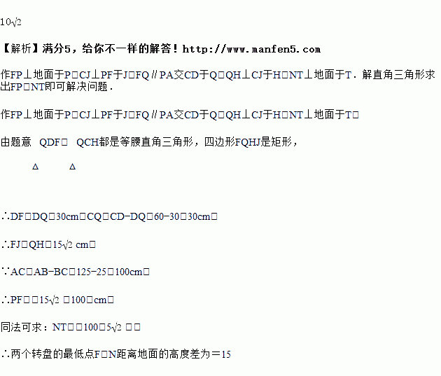 太极揉推器是一种常见的健身器材.基本结构包括支架和转盘,数学兴趣小组的同学对某太极揉推器的部分数据进行了测量:如图,立柱AB的长为125cm,支架CD、CE的长分别为60cm、40cm,支点C到立柱顶点B的距离为25cm.支架CD,CE与立柱AB的夹角∠BCD=∠BCE=45°,转盘的直径FG=MN=60cm,D,E分别是FG,MN的中点,且CD⊥FG,CE⊥MN,则两个转盘的最低点F,N距离地面的高度差为_____cm.(结果保留根号)
