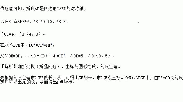 如图,OABC是一张放在平面直角坐标系中的矩形纸片,O为原点,点A在x轴的正半轴上,点C在y轴的正半轴上,OA=10,OC=8.在OC边上取一点D,将纸片沿AD翻折,使点O落在BC边上的点E处,求D,E两点的坐标.
