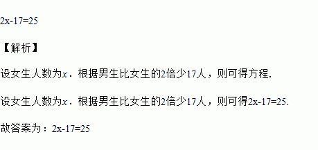 某班有男生25人,比女生的2倍少17人,这个班有女生多少人?设女生人数为x.则可得方程___________.
