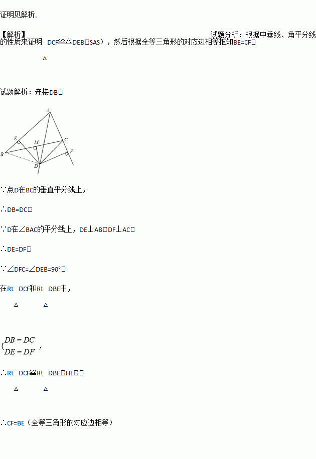 如图,在△ABC中,M为BC的中点,DM⊥BC,DM与∠BAC的角平分线交于点D,DE⊥AB,DF⊥AC,E、F为垂足,求证:BE=CF.