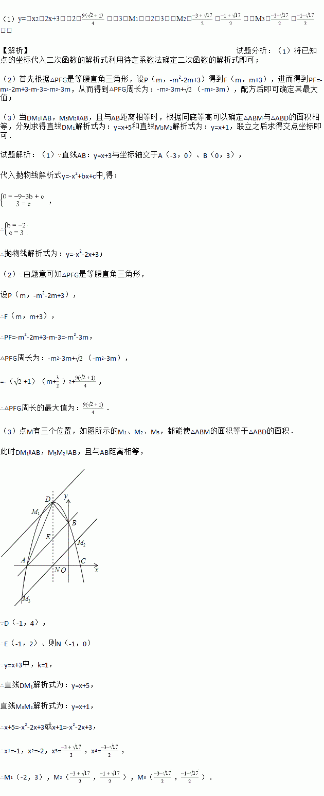(3)在抛物线y=﹣x2+bx+c上是否存在除点D以外的点M,使得△ABM与△ABD的面积相等?若存在,请求出此时点M的坐标;若不存在,请说明理由.