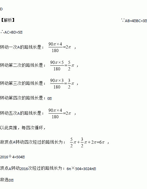 D 【解析】∵AB=4,BC=3, ∴AC=BD=5, 转动一次A的路线长是: , 转动第二次的路线长是: , 转动第三次的路线长是: , 转动第四次的路线长是:0, 转动五次A的路线长是: , 以此类推,每四次循环, 故顶点A转动四次经过的路线长为: , 2016÷4=504, 顶点A转动2016次经过的路线长为:6π×504=3...