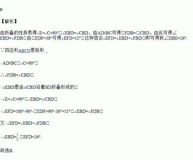 如图,将矩形纸片ABCD沿对角线BD折叠,点C落在点E处,BE与AD相交于点F,∠EDF=38°,则∠DBE的度数是( )