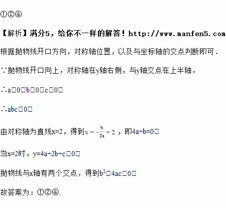 如图,已知二次函数y=ax2+bx+c(a≠0)的图象如图所示,下列4个结论:①abc<0;②4a+b=0;③4a+2b+c>0;④b2﹣4ac>0.其中正确的结论_____(只填序号)