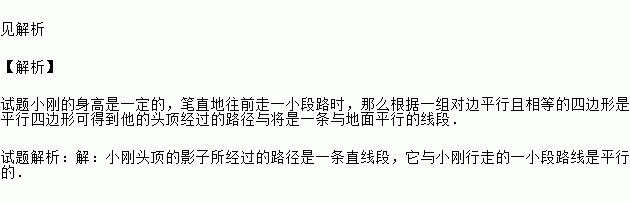 晚上,小明在马路的一侧散步,前面有一盏路灯.当小明笔直地往前行走时,他在这盏路灯下的影子也随之向前移动,小明“头顶”的影子所经过的路径是怎样的?它与小明行走的路线有何位置关系?
