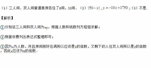 (2)设三人间共住了x人,则双人间住了 人,一天一共花去住宿费用y元表示,写出y与x的函数关系式;