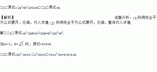 (1)原式= 2a2+b2=2+2=4;(2)原式=4. 【解析】试题分析:(1)利用完全平方公式展开,化简,代入求值. (2) 利用完全平方公式展开,化简,整体代入求值. 解:(1)原式=a2-2ab+a2+2ab+b2=2a2+b2. 当a=-1,b=时,原式=2+2=4. (2)原式=2x2-3x+1-(x2+2x+1)+1=x2-5x+1=3+1=4.