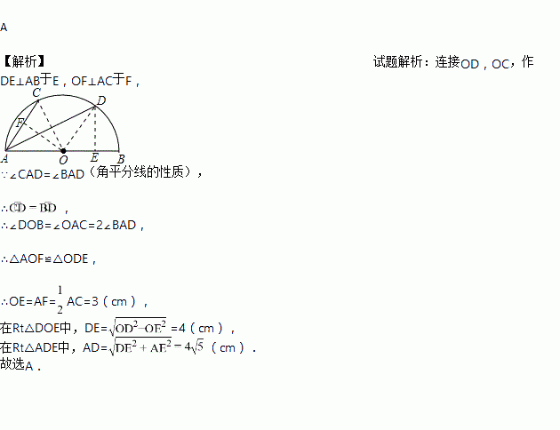 如图,半圆O的直径AB=10cm,弦AC=6cm,AD平分∠BAC,则AD长( )