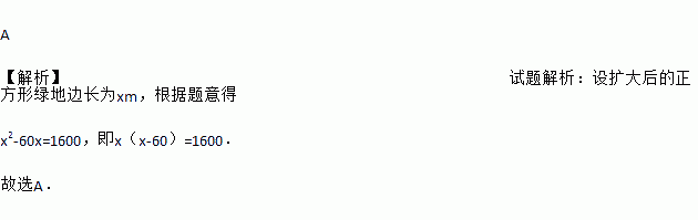 今年我市计划扩大城区绿地面积,现有一块长方形绿地,它的短边长为60m,若将短边增大到与长边相等(长边不变),使扩大后的绿地的形状是正方形,则扩大后的绿地面积比原来增加1600m2.设扩大后的正方形绿地边长为x m,下面所列方程正确的是( )