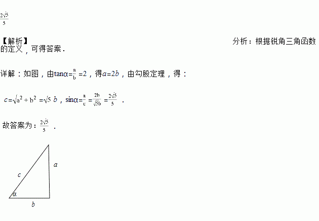 已知锐角α,满足tanα=2,则sinα=_____.