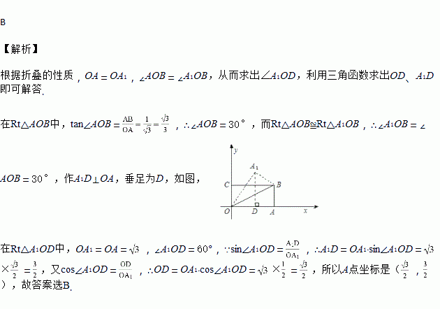 如图,在直角坐标系中,将矩形OABC沿OB对折,使点A落在A1处,已知OA=,AB=1,则点A1的坐标是( )
