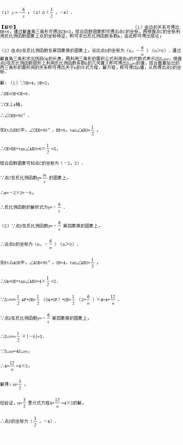 (2)若点D是反比例函数图象在第四象限上的点,过点D作DF⊥y轴,垂足为点F,连接OD、BF.如果S△BAF=4S△DFO,求点D的坐标.