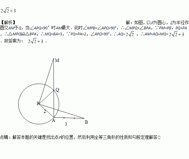 如图,点P为线段AB外一动点,PA=2,AB=3,以P为直角顶点作等腰Rt△MPB,(△MPB的三个顶点按顺时针顺序排列为P、M、B),则线段AM长的最大值为
