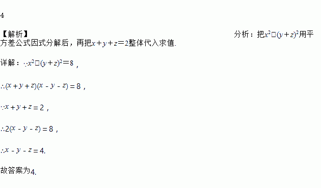 若x+y+z=2,x2﹣(y+z)2=8时,x﹣y﹣z=________.