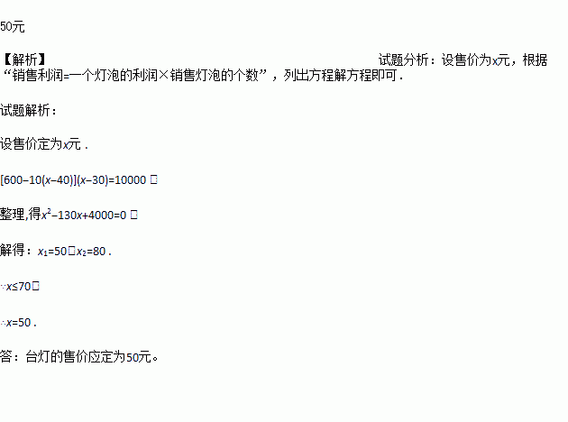 某商场将进货价为30元的台灯以40元售出,平均每月能售出600个.调查表明:这种台灯的售价每上涨1元,其销售量就将减少10个,但售价不能超过70元.为了实现平均每月10000元的销售利润,这种台灯的售价应定为多少元?