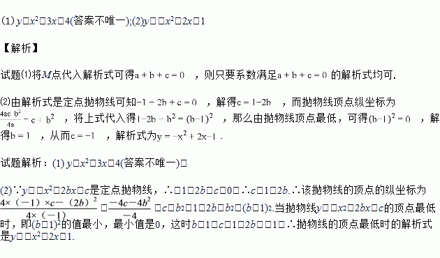 (2)张老师又在投影屏幕上出示了一个思考题:已知定点抛物线y=-x2+2bx+c,求该抛物线的顶点最低时的解析式.