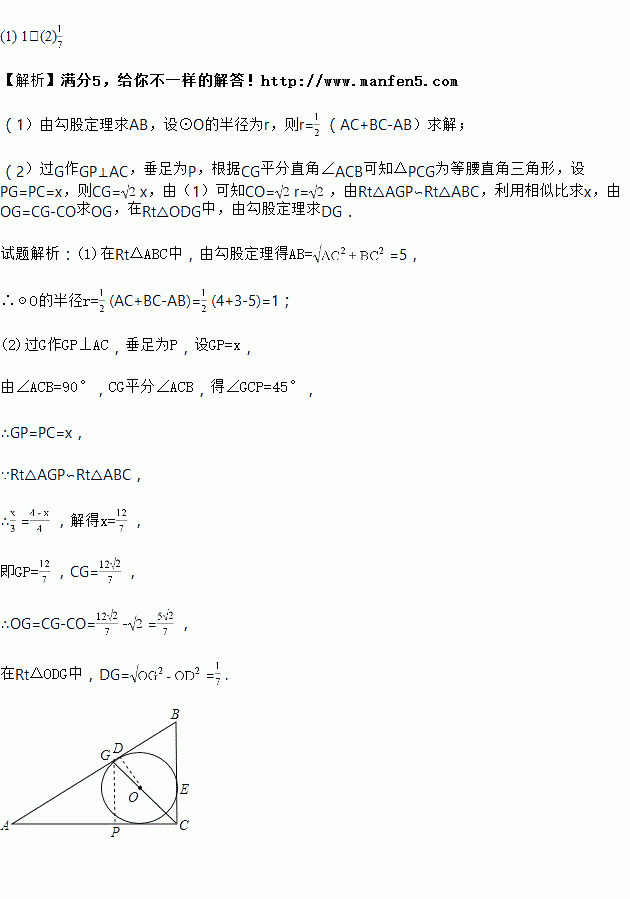 如图,Rt△ABC的两直角边AC边长为4,BC边长为3,它的内切圆为⊙O,⊙O与边AB、BC、AC分别相切于点D、E、F,延长CO交斜边AB于点G.