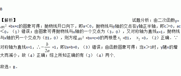B 【解析】试题分析:由二次函数y= +bx+c的图象可得:抛物线开口向下,即a<0,抛物线与y轴的交点在y轴正半轴,即c>0,ac<0,(1)错误;由图象可得抛物线与x轴的一个交点为(3,0),又对称轴为直线x=1,抛物线与x轴的另一个交点为(﹣1,0),则方程+bx+c=0的两根是=﹣1, =3,(2)正确.∵对称轴为直线x=1,∴=1,即2a+b=0,(3)错误;由函数图象可得:当x>...