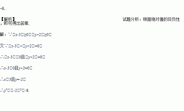 若︱x-3︱+︱y+2︱=0,求yx的值。