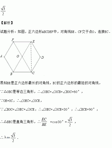 我们规定:一个正n边形(n为整数,n≥4)的最短对角线与最长对角线长度的比值叫做这个正n边形的“特征值”,记为λn,那么λ6= .