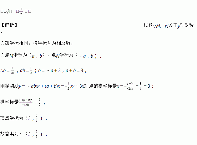 已知M、N两点关于y轴对称,且点M在双曲线上,点N在直线y=﹣x+3上,设点M坐标为(a,b),则y=﹣abx2+(a+b)x的顶点坐标为 .