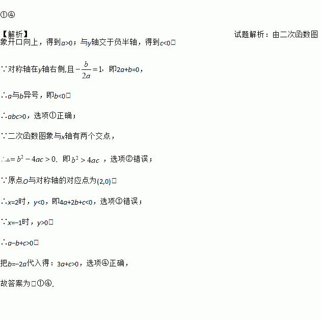 二次函数y=ax2+bx+c(a≠0)的图象如图所示,对称轴为x=1,给出下列结论:①abc>0;②b2=4ac;③4a+2b+c>0;④3a+c>0,其中正确的结论是________.(写出正确命题的序号)
