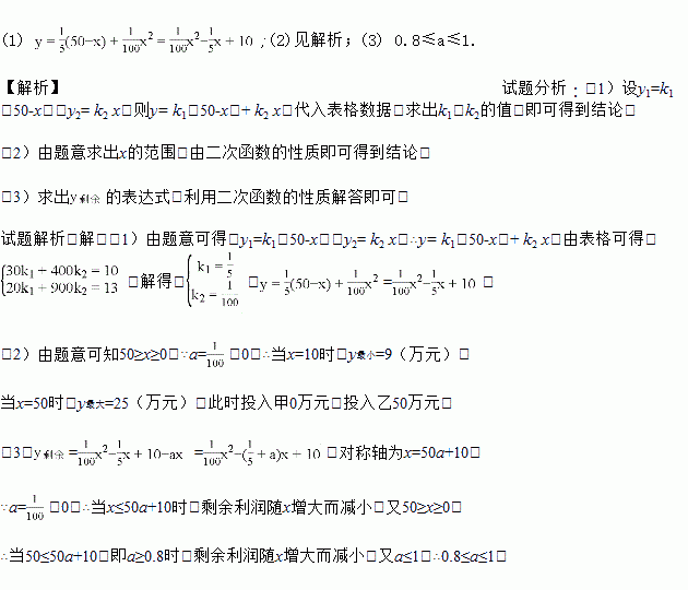 (3)若从年总利润扣除投入乙产品资金的a倍(a≤1)后,剩余利润随x增大而减小,求a的取值