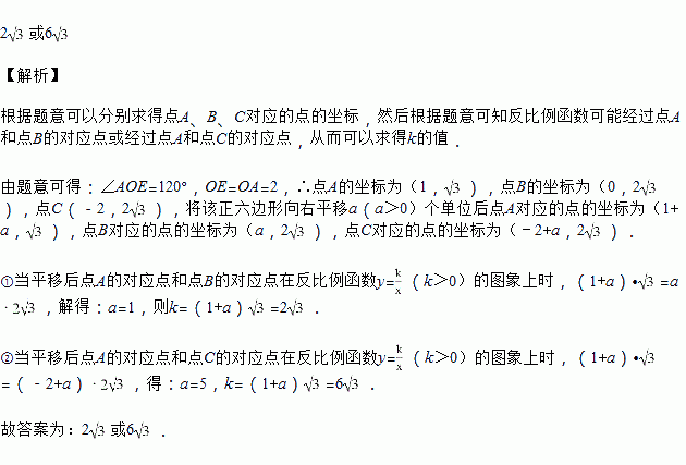 如图,正六边形OABCDE中,点E(﹣2,0),将该正六边形向右平移a(a>0)个单位后,恰有两个顶点落在反比例函数y=(k>0)的图象上,则k的值为__.