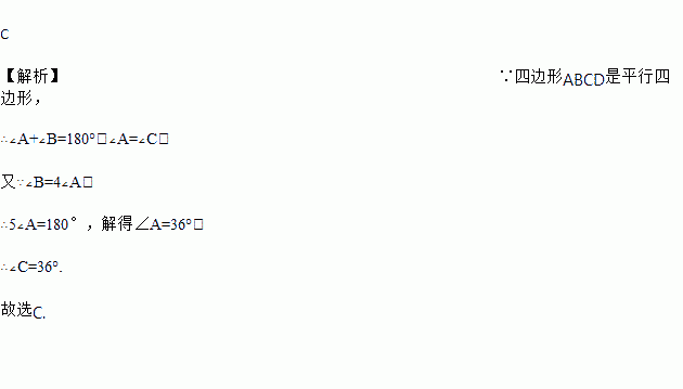 已知平行四边形ABCD中,∠B=4 ∠A,则∠C= ---------------------------( )