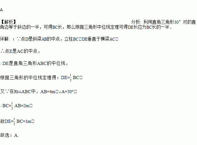 如图,是屋架设计图的一部分,点D是斜梁AB的中点,立柱BC、DE垂直于横梁AC,AB=4m,∠A=30°,则DE等于( )