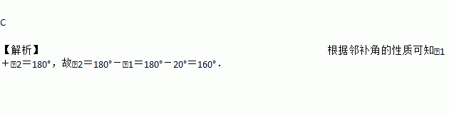 如图,直线a,b相交于点O,若∠1=20°,则∠2等于( ).