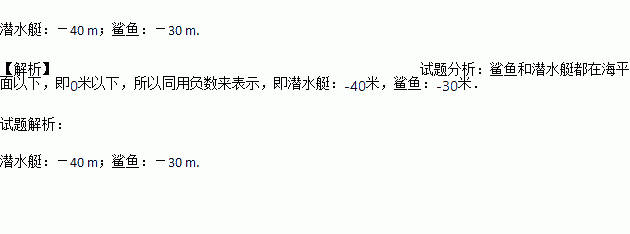 如果海平面的高度为0 m,一潜水艇在海平面以下40 m处航行,一条鲨鱼在潜水艇上方10 m处游动,试用正、负数分别表示潜水艇和鲨鱼所处的位置.