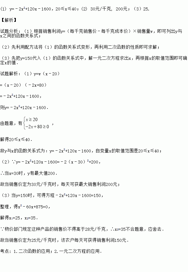 某农户生产经销一种农副产品,已知这种产品的成本价为20元/千克.市场调查发现,该产品每天的销售量w (千克)与销售价x (元/千克)有如下关系:w=﹣2x+80.设这种产品每天的销售利润为y (元).
