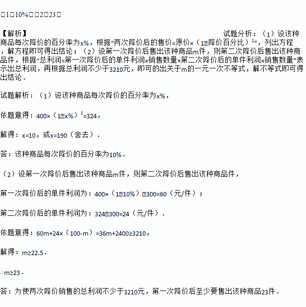 (1)10%;(2)23. 【解析】试题分析:(1)设该种商品每次降价的百分率为x%,根据“两次降价后的售价=原价×(1﹣降价百分比)2”,列出方程,解方程即可得出结论;(2)设第一次降价后售出该种商品m件,则第二次降价后售出该种商品件,根据“总利润=第一次降价后的单件利润×销售数量+第二次降价后的单件利润×销售数量”表示出总利润,再根据总利润不少于3210元,即可的出关于m的一元一次不等式...