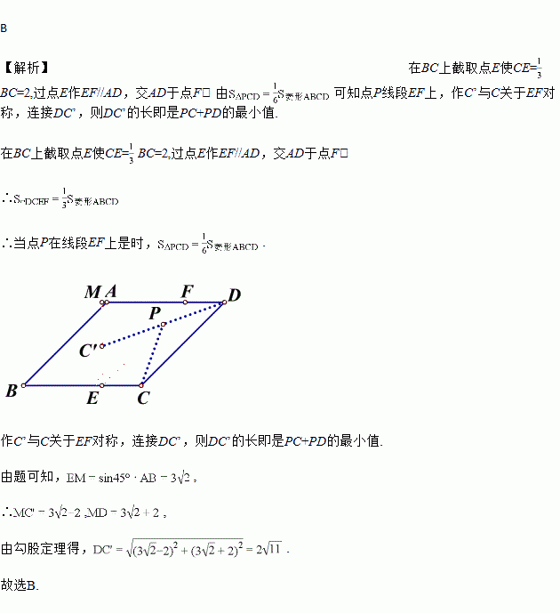 如图,在菱形ABCD中,AB=6,∠A=135°,点P是菱形内部一点,且满足,则PC+PD的最小值为( )