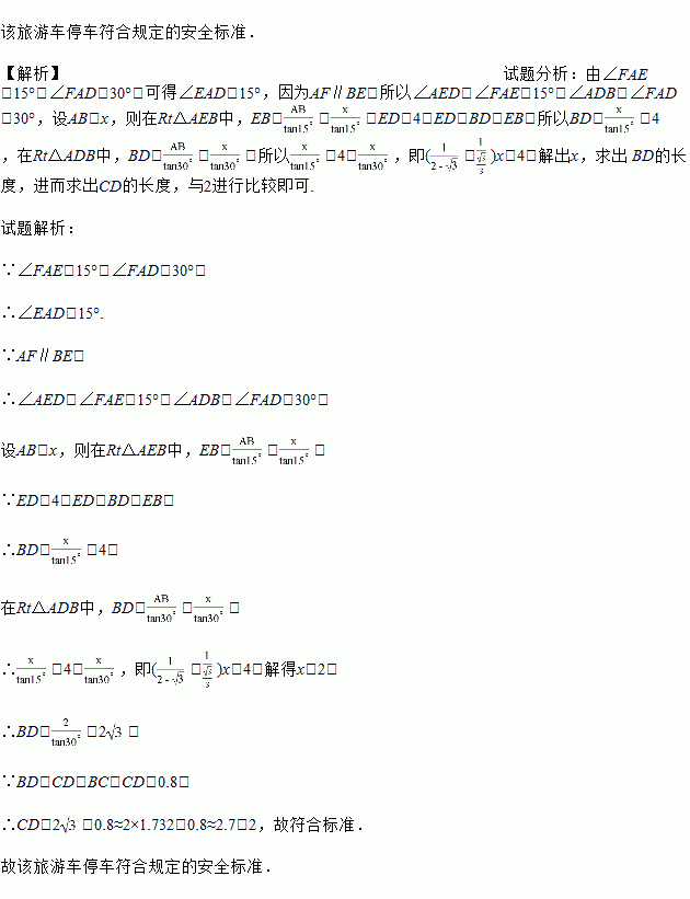 如图,某小学门口有一直线马路,交警在门口设有一条宽度为4米的斑马线,为安全起见,规定车头距斑马线后端的水平距离不得低于2米,现有一旅游车在路口遇红灯刹车停下,汽车里司机与斑马线前后两端的视角分别为∠FAE=15°和∠FAD=30°,司机距车头的水平距离为0.8米,试问该旅游车停车是否符合上述安全标准?(E,D,C,B四点在平行于斑马线的同一直线上)(参考数据:tan15°=2-