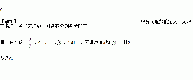 C 【解析】根据无理数的定义:无限不循环小数是无理数,对各数分别判断即可. 【解析】 在实数-,0,π, ,1.41中,无理数有π和,共2个. 故选C.