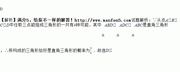 (2016四川省达州市)如图,在5×5的正方形网格中,从在格点上的点A,B,C,D中任取三点,所构成的三角形恰好是直角三角形的概率为( )