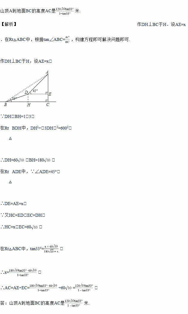 如图,一座山的一段斜坡BD的长度为600米,且这段斜坡的坡度i=1:3(沿斜坡从B到D时,其升高的高度与水平前进的距离之比).已知在地面B处测得山顶A的仰角为33°,在斜坡D处测得山顶A的仰角为45°.求山顶A到地面BC的高度AC是多少米?(结果用含非特殊角的三角函数和根式表示即可)