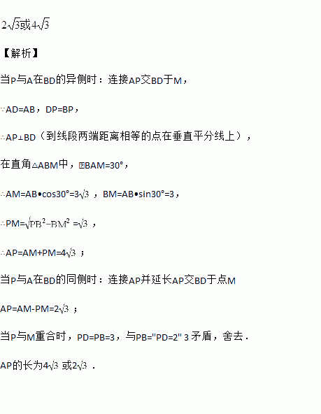已知菱形ABCD的边长为6,∠A=600,如果点P是菱形内一点,且PB=PD =2,那么AP的长为 .