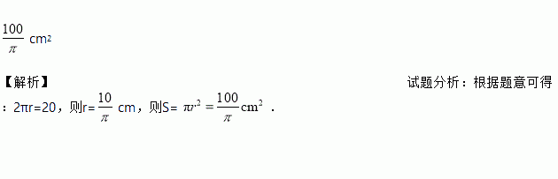 cm2 【解析】试题分析:根据题意可得:2πr=20,则r=cm,则S= .