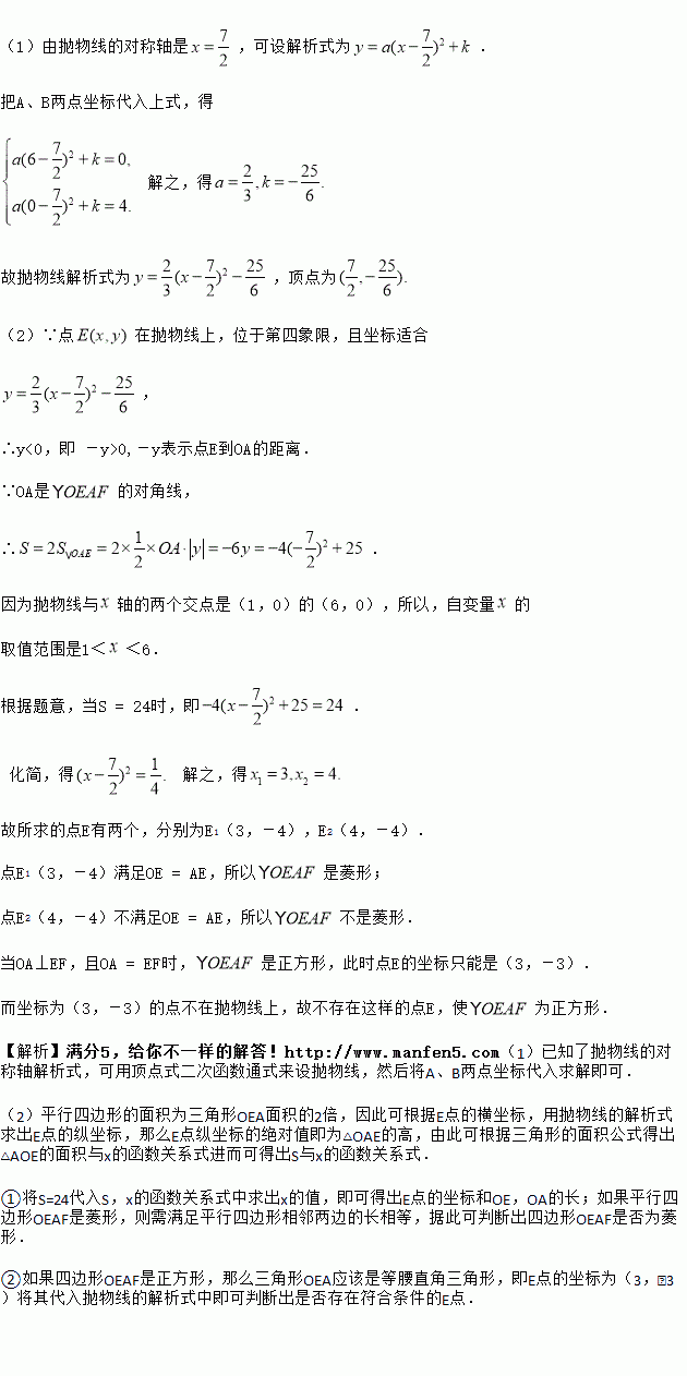 (2)设点E(x,y)是抛物线上一动点,且位于第四象限,四边形OEAF是以OA为对角线的平行四边形,求四边形OEAF的面积S与x之间的函数关系式,并写出自变量x的取值范围;