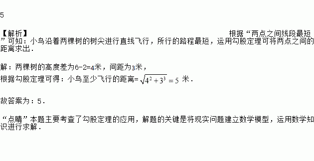 有两棵树,一棵高6米,另一棵高2米,两树相距3米,小鸟从一棵树的树梢飞到另一棵树的树梢,至少飞了________米.