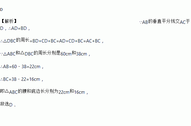 已知如图,△ABC中,AB=AC,AB的垂直平分线交AC于D,△ABC和△DBC的周长分别是60cm和38cm,则△ABC的腰和底边长分别为( )